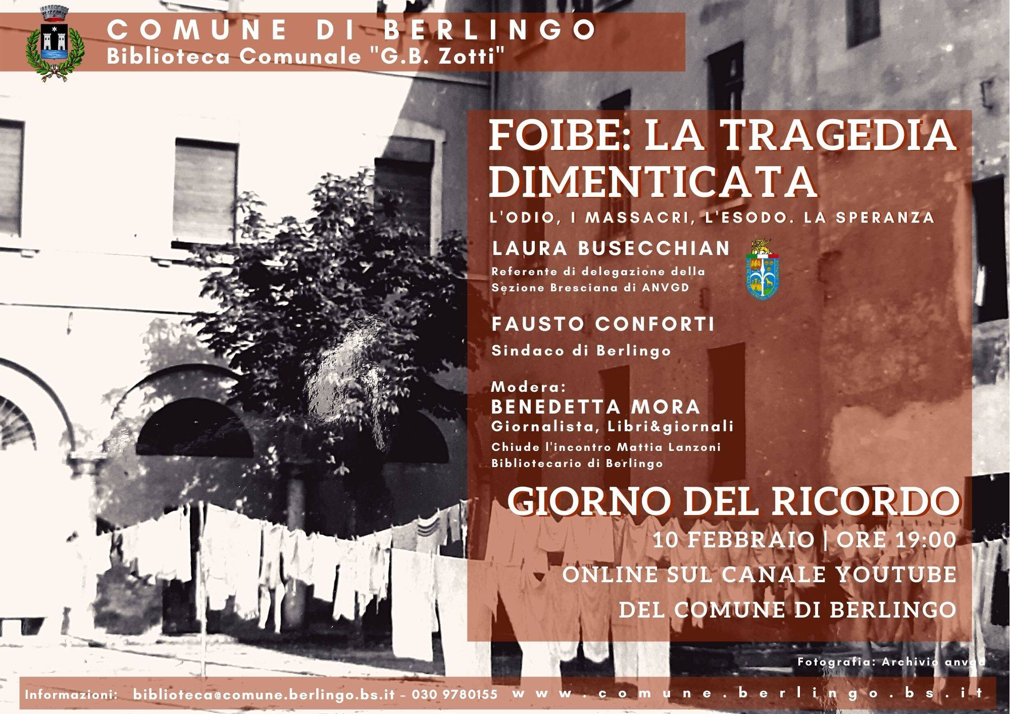In occasione del prossimo 10 di febbraio, Giorno del Ricordo, il Comune di Berlingo, in collaborazione con la Biblioteca "G.B. Zotti", torna ad aprire un momento di riflessione con l'appuntamento dal titolo "Foibe: la tragedia dimenticata. L'odio, i massacri, l'esodo. La speranza".