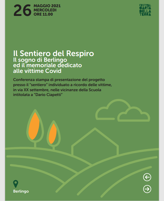 Si fermerà anche a Berlingo, il prossimo 26 di maggio, per parlare del progetto che porterà alla realizzazione di un sentiero dedicato alle vittime berlinghesi da Covid il Festival Carta della Terra 2021. Promosso da Fondazione Cogeme l'evento giunge alla sua sesta edizione proseguendo l’intento della Fondazione nel diffondere il più possibile i messaggi della Carta della Terra attraverso iniziative che coinvolgano le Comunità locali. 24 in tutto, tra la Franciacorta e la Pianura, i comuni inseriti nel calendario 2021 che ha preso il via il 22 aprile scorso, “Giornata mondiale della terra”, per chiudersi il 28 giugno prossimo insieme alla Microeditoria di Chiari. Tra i patrocini, sempre numerosi, anche l'Associazione Comuni Virtuosi, di cui il Comune di Berlingo fa parte. “Abbiamo cercato- spiega l’ideatrice e direttrice scientifica Eugenia Giulia Grechi - di ridurre a una ventina le iniziative legate alla Carta della terra ma avremmo potuto metterne in calendario molte di più; questo a significare del potenziale che la Carta della Terra esprime all’interno delle numerose Amministrazioni locali che ogni anno aderiscono alla nostra iniziativa. Nonostante le difficoltà abbiamo deciso rilanciare il Festival in veste rinnovata: partire dalla Terra per riscoprirla grazie ad iniziative pensate per essere fatte solo all’aperto”. E si terrà all'aperto anche la conferenza stampa di presentazione del progetto “Sentiero del Respiro” di Berlingo. L'appuntamento è fissato per il prossimo 26 di maggio alle ore 11.00 presso via XX Settembre. “Si tratta di un sentiero campestre- spiega il Sindaco Fausto Conforti- che si snoda fino alla frazione di Berlinghetto e che, prima di buttarsi in campagna, fiancheggia la scuola media «Dario Ciapetti». I primi 500 metri, su terreni comunali, verranno sistemati nei prossimi mesi. Stanno proseguendo gli incontri con i proprietari privati dei terreni agricoli dell’area, nel tentativo di allungare il percorso e renderlo ancora più legato al cuore del borgo. In occasione della conferenza di presentazione del progetto illustreremo anche il progetto degli Orti Comunali”.