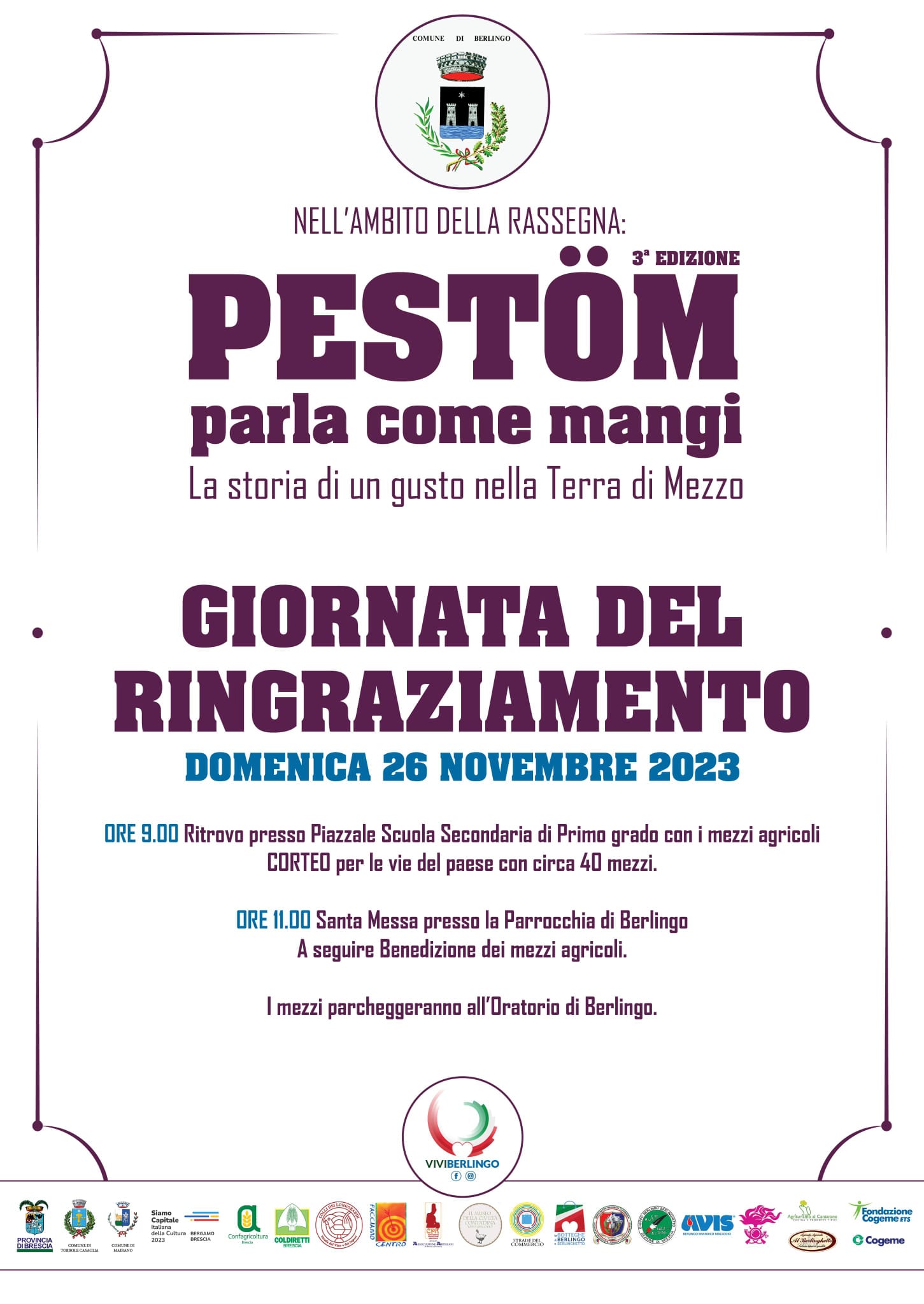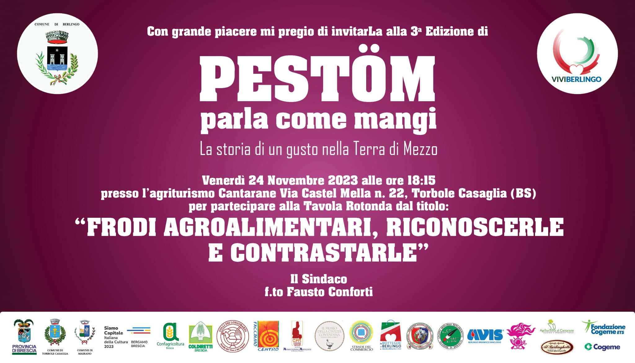 “Siamo orgogliosi di poter continuare questo progetto – spiega il sindaco di Berlingo, Fausto Conforti - con il quale intendiamo recuperare un termine, pestöm, una tradizione, ma anche abitudini e storie delle generazioni passate, comuni alla Terra di Mezzo del sottotitolo: quella porzione di territorio bresciano chiuso tra la città, la Franciacorta e la Bassa, dalle grandi potenzialità che il nostro festival mira a valorizzare e promuovere. Pestöm come cibo dell'anima, la materia prima del lavoro elevato ad arte con la fronte sudata delle donne e degli uomini bresciani. Quest'anno siamo riusciti a stringere nuove importanti sinergie, oltre a quelle già consolidate come quella con Radio Bruno, come con Cogeme e Fondazione Cogeme, con Charlie Cinelli e il suo enturage, con chef Mainardi e Manuel Battaglia e con il Museo Contadino di Mairano, solo per citarne alcune. Quest'anno abbiamo inoltre deciso di dare un taglio solidale all'intero evento: il ricavato delle serate del 23 e del 25 di novembre sarà, in tutto e in parte, devoluto al “progetto SOS Kilomoni”per la realizzazione in Congo, di una scuola per 555 bambini e di tre alloggi per le maestre. La richiesta di adesione al progetto è arrivata direttamente in Comune. Abbiamo voluto tendere la mano a chi ha bisogno per ribadire l'importanza della solidarietà, valore fondante della nostra tradizione contadina”.