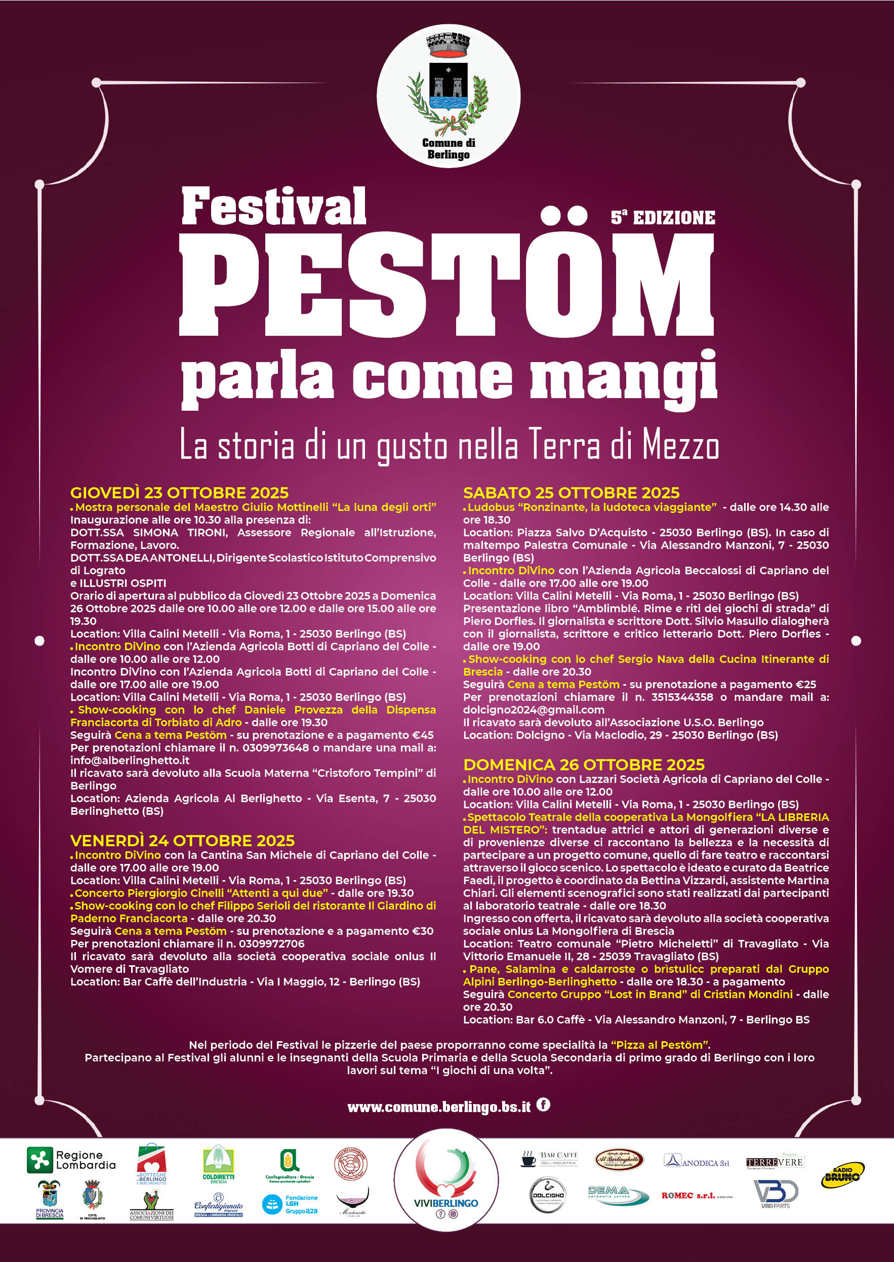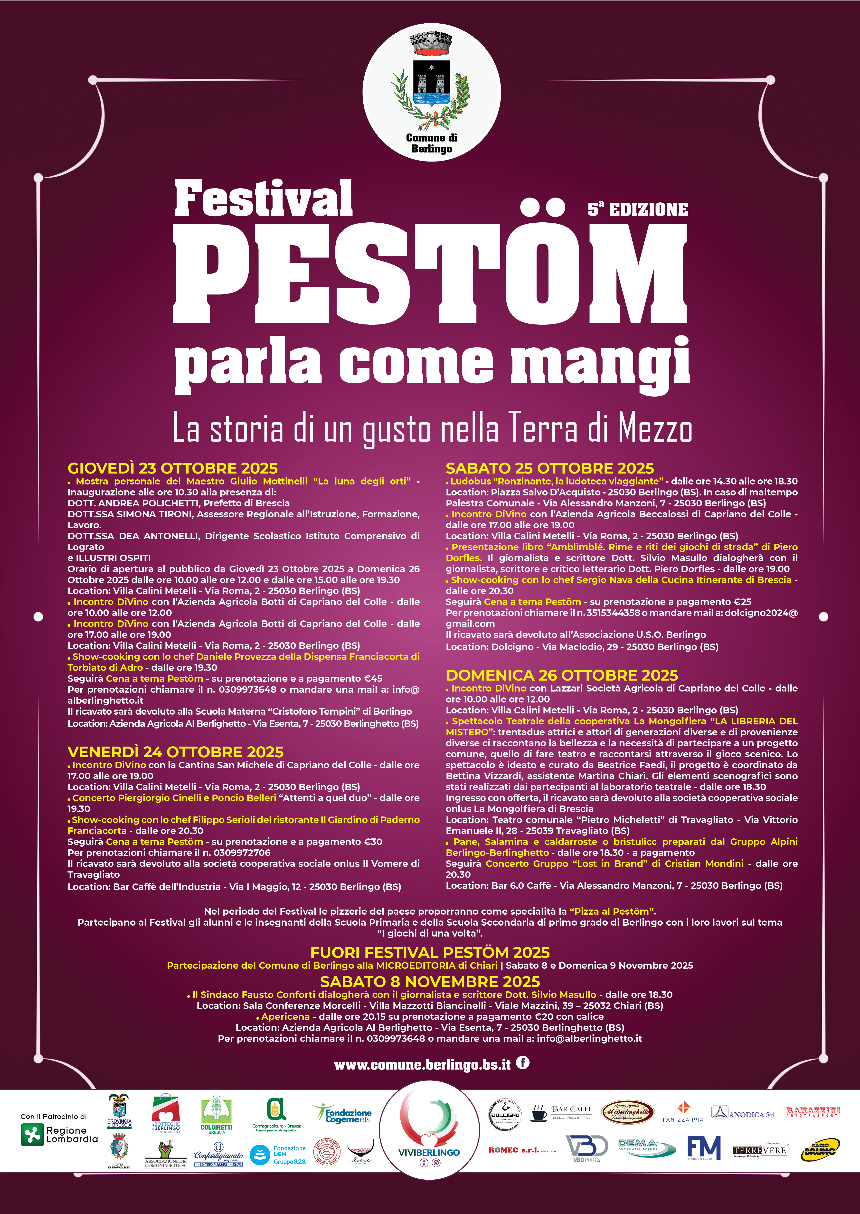Quando parlo di Pestöm non parlo soltanto di un impasto, di un sapore o di una ricetta. Parlo di mani che si ricordano, di odori che richiamano storie, di gesti che si ripetono come un rito domestico. Il pestöm è un filo che attraversa le nostre famiglie, i nostri pranzi, le nostre stagioni; è la traccia materiale di una memoria che vogliamo custodire e rendere viva. Da quella memoria è nato un festival che, dalla prima edizione del 2021 a oggi, ha saputo trasformare ricordi familiari in progettualità collettiva, in occasioni di incontro tra arte, scuola, impresa e solidarietà.