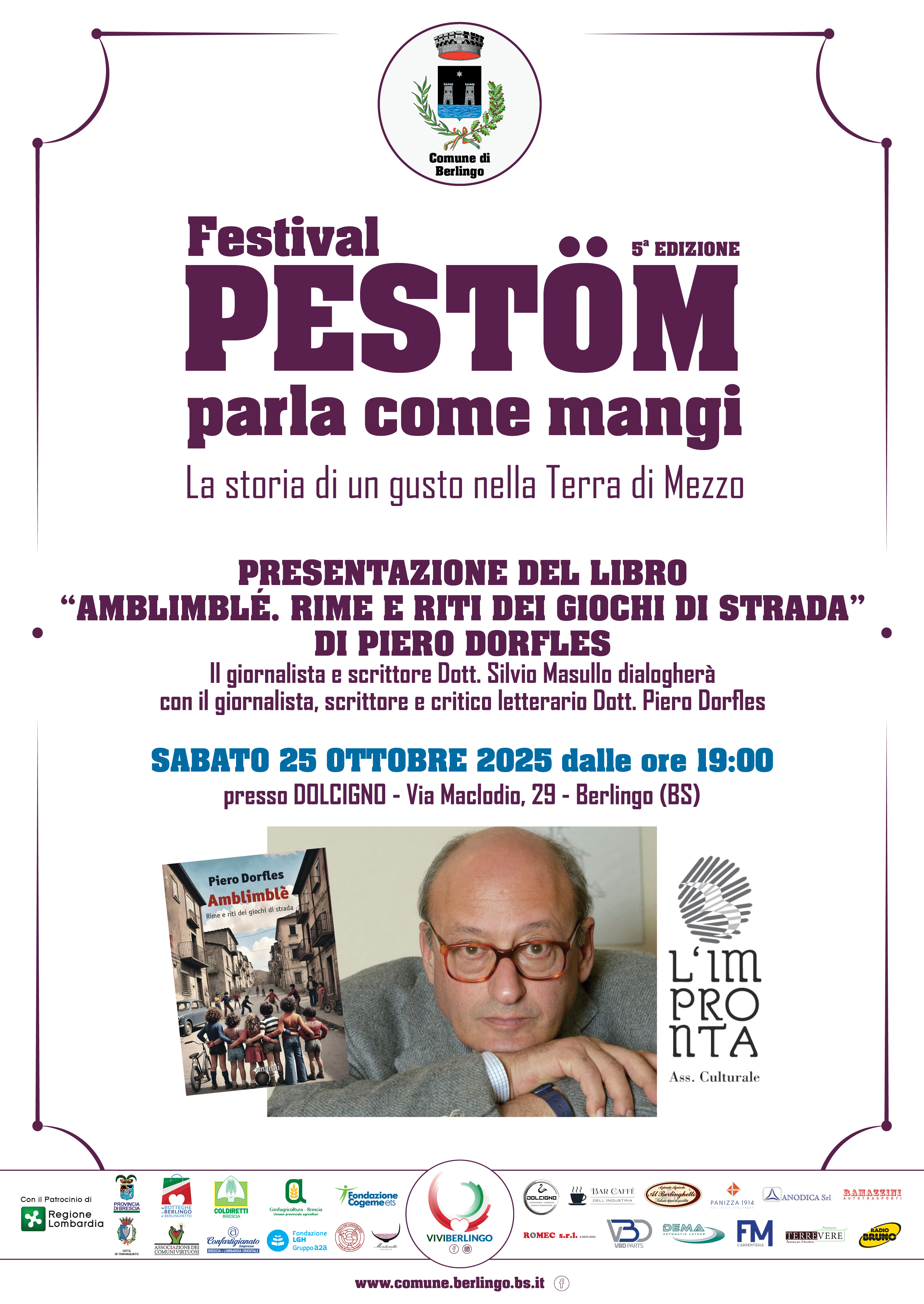 - Presentazione libro “Amblimblé. Rime e riti dei giochi di strada” di Piero Dorfles. Il giornalista e scrittore Dott. Silvio Masullo dialogherà con il giornalista, scrittore e critico letterario Dott. Piero Dorfles - dalle ore 19.00