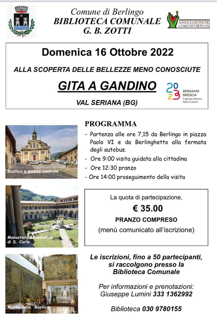 Presso al biblioteca comunale sono aperte le iscrizioni per la gita di Domenica 16 Ottobre a Gandino (BG).